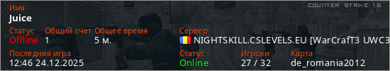 Играет на Counter Strike 1.6 сервере. Страна: РумынияПервый раз замечен 12:42 24.12.2025