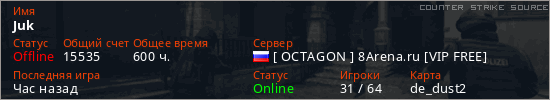 Играет на Counter Strike Source сервере. Страна: РоссияПервый раз замечен 15:21 08.09.2021
