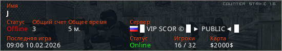 Играет на Counter Strike 1.6 сервере. Страна: РоссияПервый раз замечен 08:54 10.02.2026