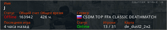 Играет на Counter Strike 1.6 сервере. Страна: РоссияПервый раз замечен 10:37 10.11.2019