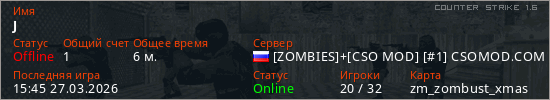 Играет на Counter Strike 1.6 сервере. Страна: РоссияПервый раз замечен 15:40 27.03.2026
