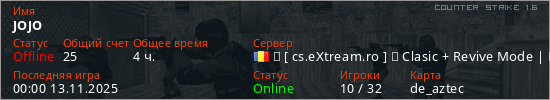 Играет на Counter Strike 1.6 сервере. Страна: РумынияПервый раз замечен 01:22 08.01.2025