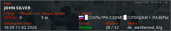 Играет на Counter Strike 1.6 сервере. Страна: РоссияПервый раз замечен 16:37 11.02.2026
