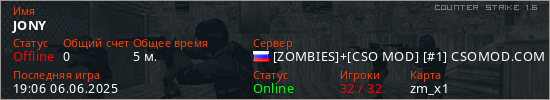 Играет на Counter Strike 1.6 сервере. Страна: РоссияПервый раз замечен 19:02 06.06.2025