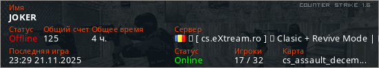 Играет на Counter Strike 1.6 сервере. Страна: РумынияПервый раз замечен 21:07 27.10.2024