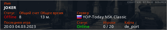 Играет на Counter Strike Source сервере. Страна: РоссияПервый раз замечен 19:53 04.03.2023