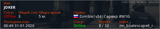 Играет на Counter Strike Source сервере. Страна: РоссияПервый раз замечен 23:49 30.01.2026