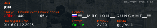 Играет на Counter Strike 1.6 сервере. Страна: РоссияПервый раз замечен 20:34 03.11.2022