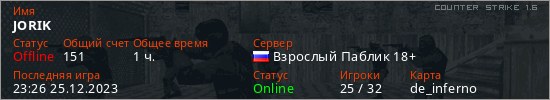 Играет на Counter Strike 1.6 сервере. Страна: РоссияПервый раз замечен 23:55 22.08.2022