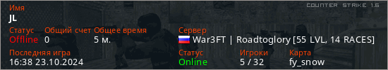 Играет на Counter Strike 1.6 сервере. Страна: РоссияПервый раз замечен 16:36 23.10.2024