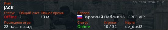 Играет на Counter Strike 1.6 сервере. Страна: РоссияПервый раз замечен 08:30 26.01.2026