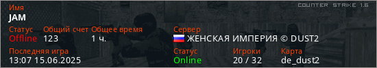 Играет на Counter Strike 1.6 сервере. Страна: РоссияПервый раз замечен 19:13 05.02.2025