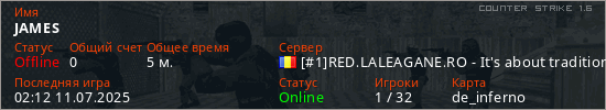 Играет на Counter Strike 1.6 сервере. Страна: РумынияПервый раз замечен 02:10 11.07.2025