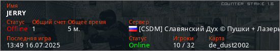 Играет на Counter Strike 1.6 сервере. Страна: РоссияПервый раз замечен 12:41 16.07.2025