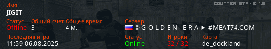 Играет на Counter Strike 1.6 сервере. Страна: РоссияПервый раз замечен 11:41 06.08.2025