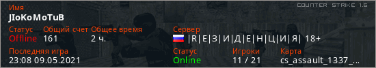 Последний раз был в сети 23:08 09.05.2021 Игрок с таким ником замечен на 3 серверах