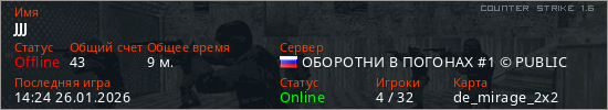 Играет на Counter Strike 1.6 сервере. Страна: РоссияПервый раз замечен 13:26 26.01.2026
