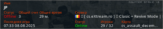 Играет на Counter Strike 1.6 сервере. Страна: РумынияПервый раз замечен 08:09 18.12.2024