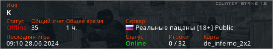 Играет на Counter Strike 1.6 сервере. Страна: РоссияПервый раз замечен 10:32 14.01.2023