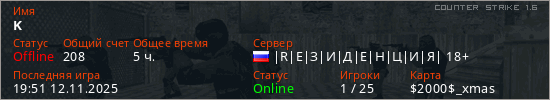 Играет на Counter Strike 1.6 сервере. Страна: РоссияПервый раз замечен 01:18 24.01.2019