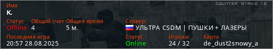 Играет на Counter Strike 1.6 сервере. Страна: РоссияПервый раз замечен 20:47 28.08.2025
