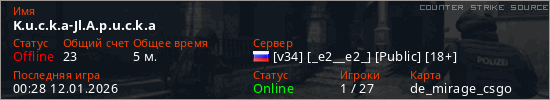 Играет на Counter Strike Source сервере. Страна: РоссияПервый раз замечен 00:26 12.01.2026
