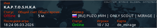 Играет на Counter Strike Global Offensive сервере. Страна: РоссияПервый раз замечен 18:20 06.03.2026