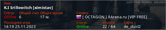 Играет на Counter Strike Source сервере. Страна: РоссияПервый раз замечен 20:52 13.11.2023