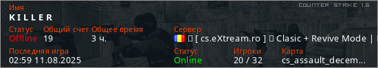 Играет на Counter Strike 1.6 сервере. Страна: РумынияПервый раз замечен 07:37 11.05.2025