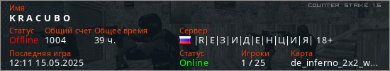 Последний раз был в сети 12:11 15.05.2025 Игрок с таким ником замечен на 20 серверах