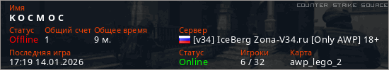 Играет на Counter Strike Source сервере. Страна: РоссияПервый раз замечен 15:55 13.01.2026