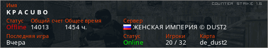 Играет на Counter Strike 1.6 сервере. Страна: РоссияПервый раз замечен 19:01 02.08.2021