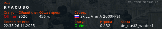 Играет на Counter Strike 1.6 сервере. Страна: РоссияПервый раз замечен 15:12 03.07.2022