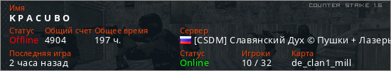 Играет на Counter Strike 1.6 сервере. Страна: РоссияПервый раз замечен 18:40 27.02.2024