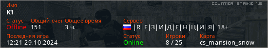 Играет на Counter Strike 1.6 сервере. Страна: РоссияПервый раз замечен 15:59 09.03.2020