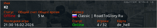 Играет на Counter Strike 1.6 сервере. Страна: РоссияПервый раз замечен 21:28 16.02.2026
