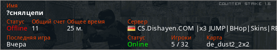 Последний раз был в сети Вчера Игрок с таким ником замечен на 11 серверах