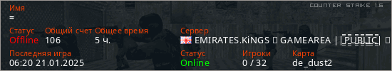 Последний раз был в сети 06:20 21.01.2025 Игрок с таким ником замечен на 46 серверах