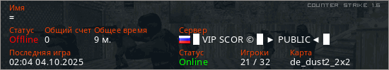 Играет на Counter Strike 1.6 сервере. Страна: РоссияПервый раз замечен 01:56 04.10.2025