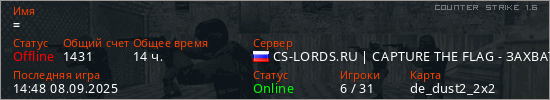 Последний раз был в сети 14:48 08.09.2025 Игрок с таким ником замечен на 46 серверах