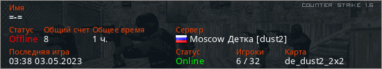 Играет на Counter Strike 1.6 сервере. Страна: РоссияПервый раз замечен 13:56 21.03.2021