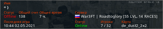 Последний раз был в сети 10:44 02.05.2021 Игрок с таким ником замечен на 5 серверах