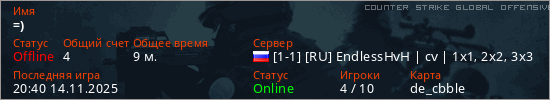 Играет на Counter Strike Global Offensive сервере. Страна: РоссияПервый раз замечен 20:27 07.11.2025