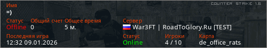 Играет на Counter Strike 1.6 сервере. Страна: РоссияПервый раз замечен 12:30 09.01.2026