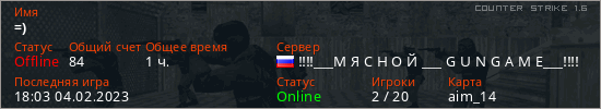 Играет на Counter Strike 1.6 сервере. Страна: РоссияПервый раз замечен 15:01 30.07.2022