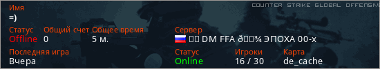 Играет на Counter Strike Global Offensive сервере. Страна: РоссияПервый раз замечен 16:05 05.03.2026