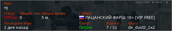 Играет на Counter Strike 1.6 сервере. Страна: РоссияПервый раз замечен 16:30 18.04.2026