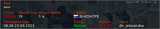 Играет на Counter Strike 1.6 сервере. Страна: РоссияПервый раз замечен 10:00 28.12.2019