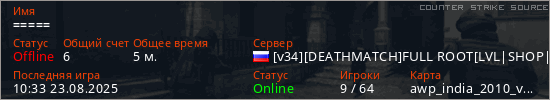 Играет на Counter Strike Source сервере. Страна: РоссияПервый раз замечен 10:29 23.08.2025