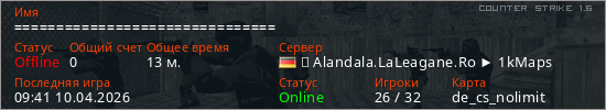 Играет на Counter Strike 1.6 сервере. Страна: ГерманияПервый раз замечен 05:57 10.04.2026